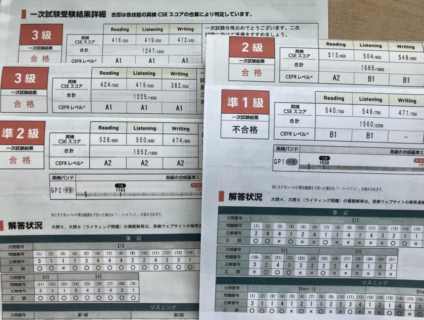 結果スコアを添付しました。不合格の生徒さんも含め、コア英語教室の生徒”らしい”、バランスの取れた得点でした。この3技能のバランスの良さが、後のびにつながります。そして、この実力があるからこそ、2次試験も”まぁ、いける”というなんとなくの(でも本当は、それは確かな実力に基ずく)自信につながるのです。